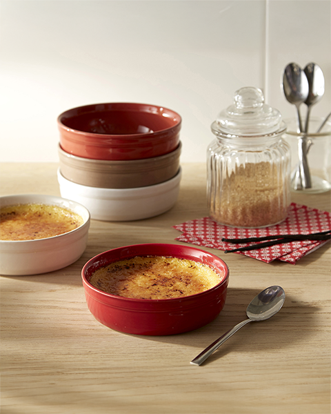 Die farbigen Crème-Brûlée-Schalen haben eine perfekte Flaschenoberfläche und einen Du...